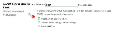 Alamat Pengeposan via Email : buatlah alamat email blogger untuk mengirimkan posting dari email atau perangkat seluler dengan cara menuliskan pada kotak yang tersedia. Misalkan alamat email anda adalah contohsaja@gmail.com maka anda bisa membuat email blogger menjadi contohsaja.post@blogger.com atau contohsaja.blog@blogger.com atau apa saja menurut anda yang bagus. Tapi ingat, rahasiakan alamat email ini agar orang lain tidak bisa posting ke blog anda